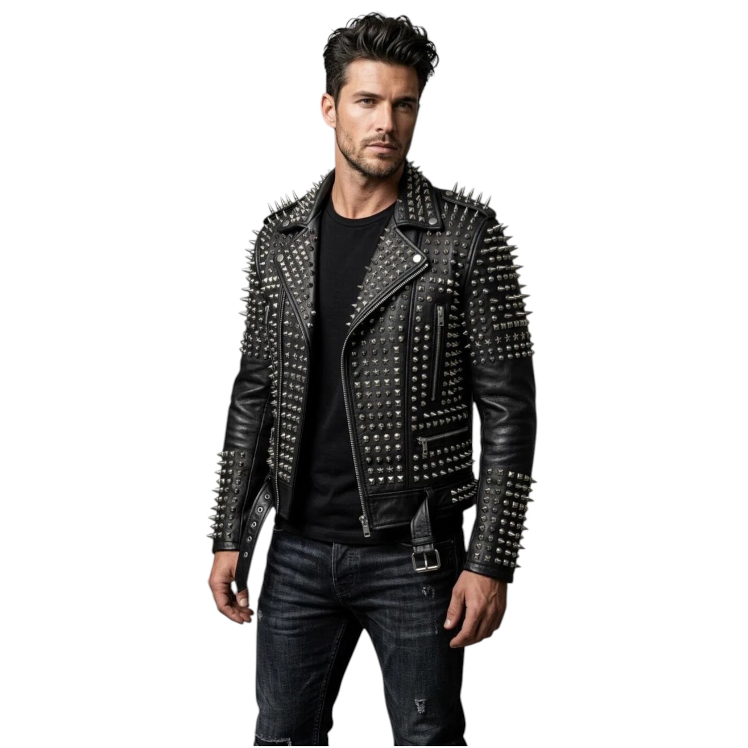 Men’s Brando Leather Jacket – Fully Studded & Spiked. Expertly handcrafted from premium quality leather, this jacket is designed for men who embrace punk, rock, and biker culture. Every inch of the jacket features carefully placed metal studs and sharp spikes, creating a fearless, edgy aesthetic that defines statement streetwear.
